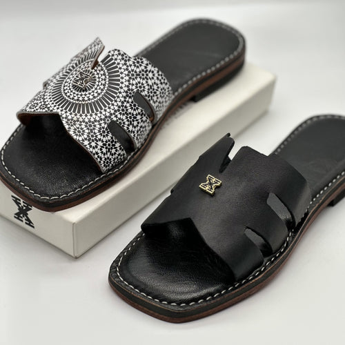 Découvrez la Sandale Black Zellige de la collection Sandales d'AIR BABOUCHE. Cette sandale marocaine est une pièce d'artisanat marocain qui célèbre la beauté du Zellige avec une touche moderne. Confectionnée avec du cuir maroc de haute qualité à Marrakech, chaque paire est handmade et reflète un savoir-faire ancestral. Son motif Zellige noir unique et son style raffiné en font un accessoire porteur d'élégance intemporelle et de caractère. C'est le choix parfait pour la femme qui valorise le patrimoine et le design audacieux.